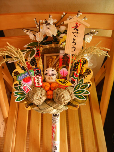今年は熊手にざるが付いていてそこにダルマや俵が付いているといったものを