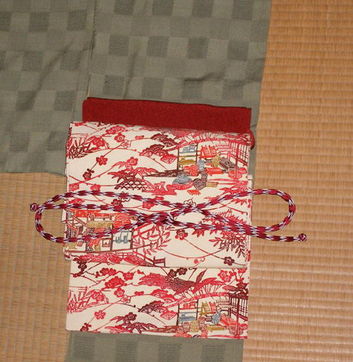 左の画像、縮緬の小紋の反物でお願いした名古屋帯が出来上がりました