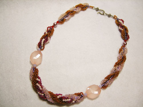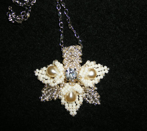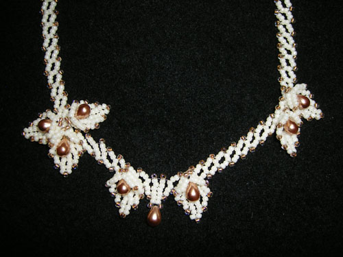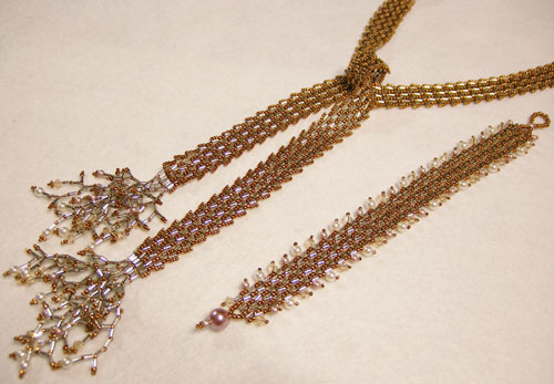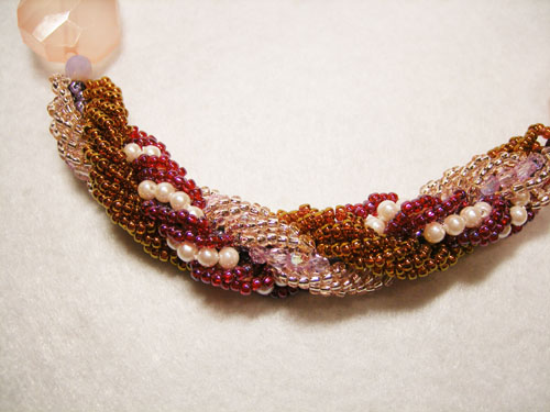 同じロシアンステッチを長く編みネックレスにした土台にパールのしずくを入れた